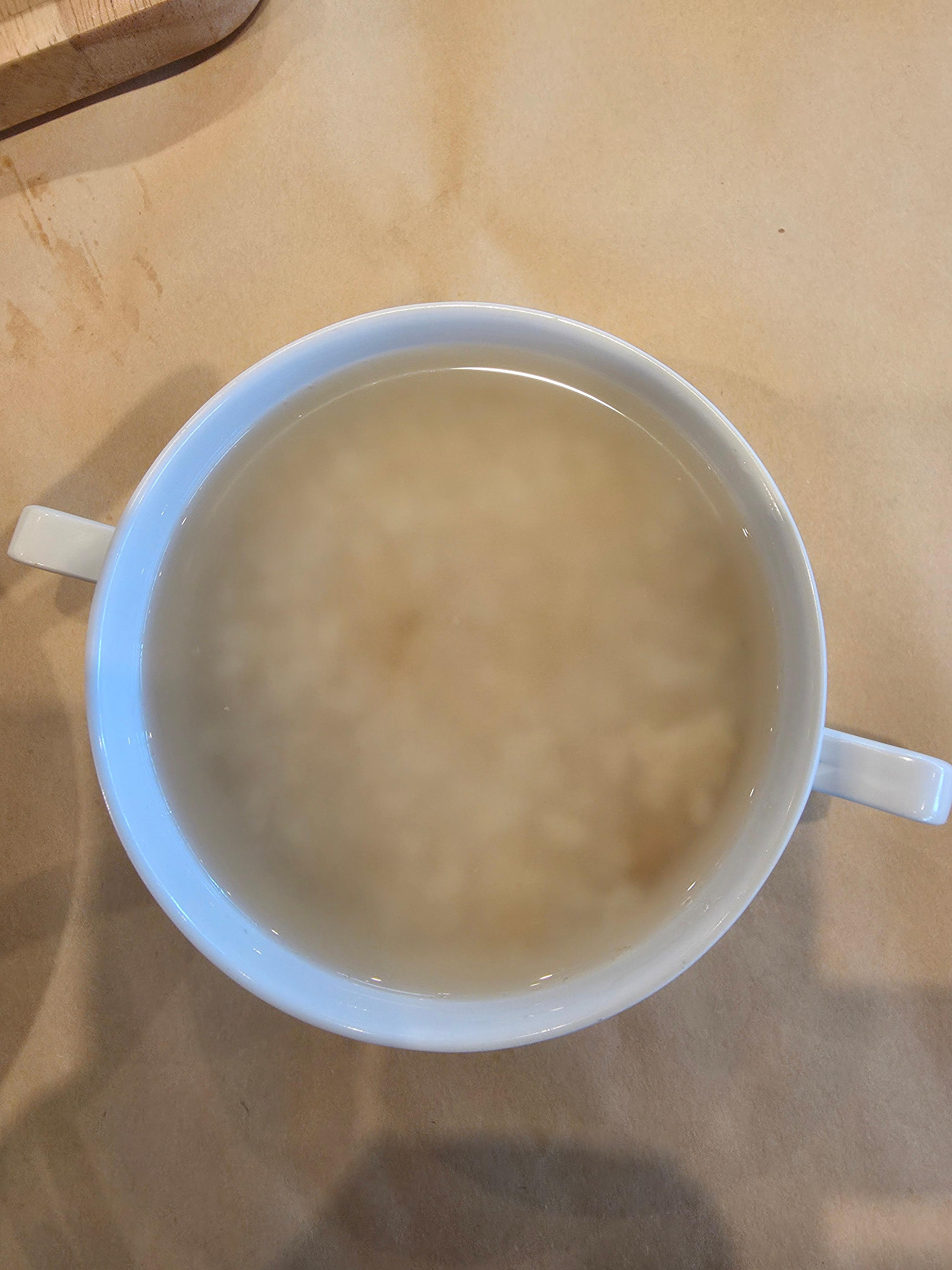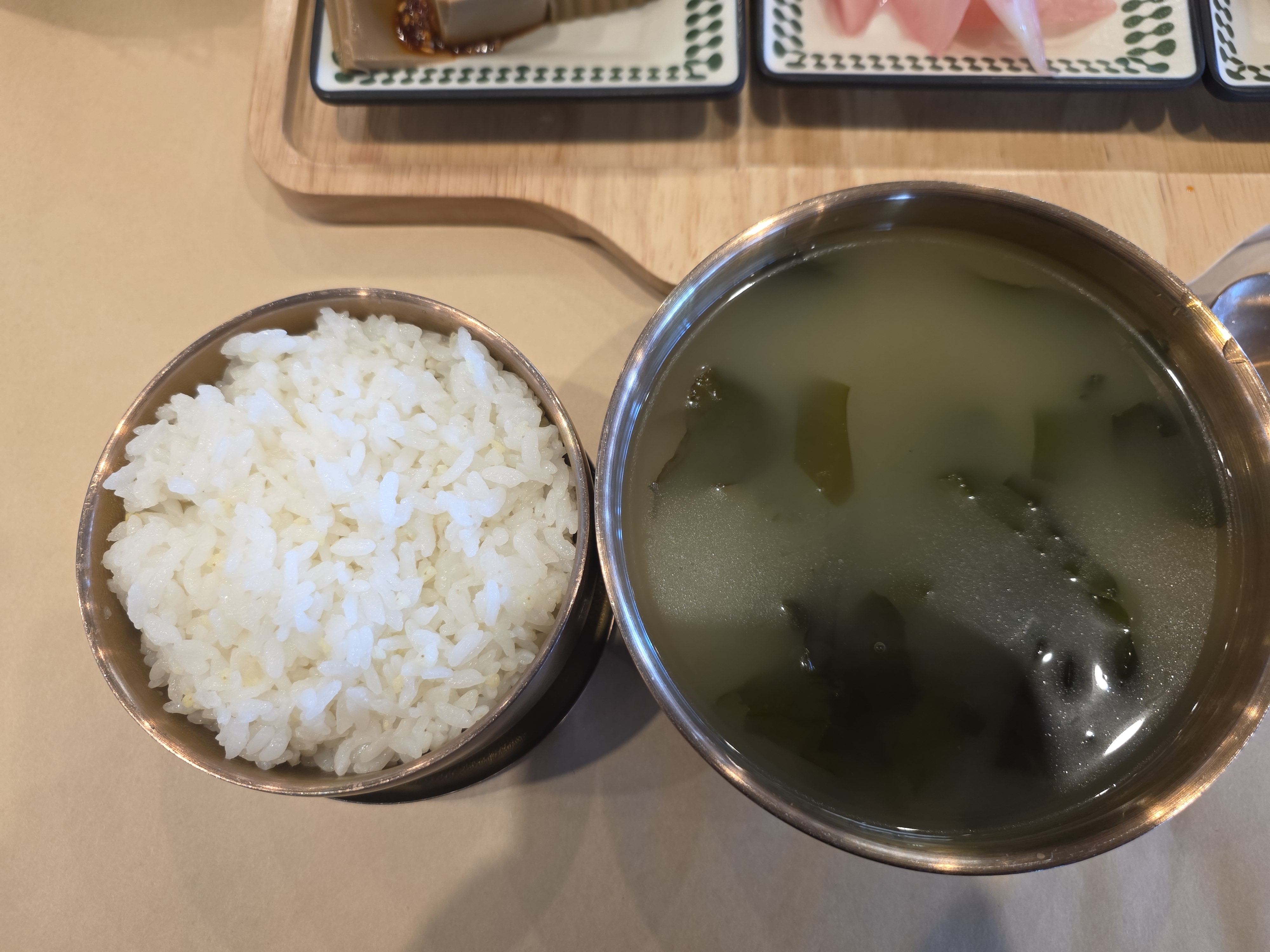 주문 후 약 5분 정도 지나니 반찬을 담을 수 있는 나무 트레이와 미역국 밥이 먼저 나왔어요