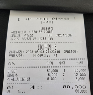 총 금액은 ₩80,000 (B세트 60,000 + 매화수 2병 6,000×2)