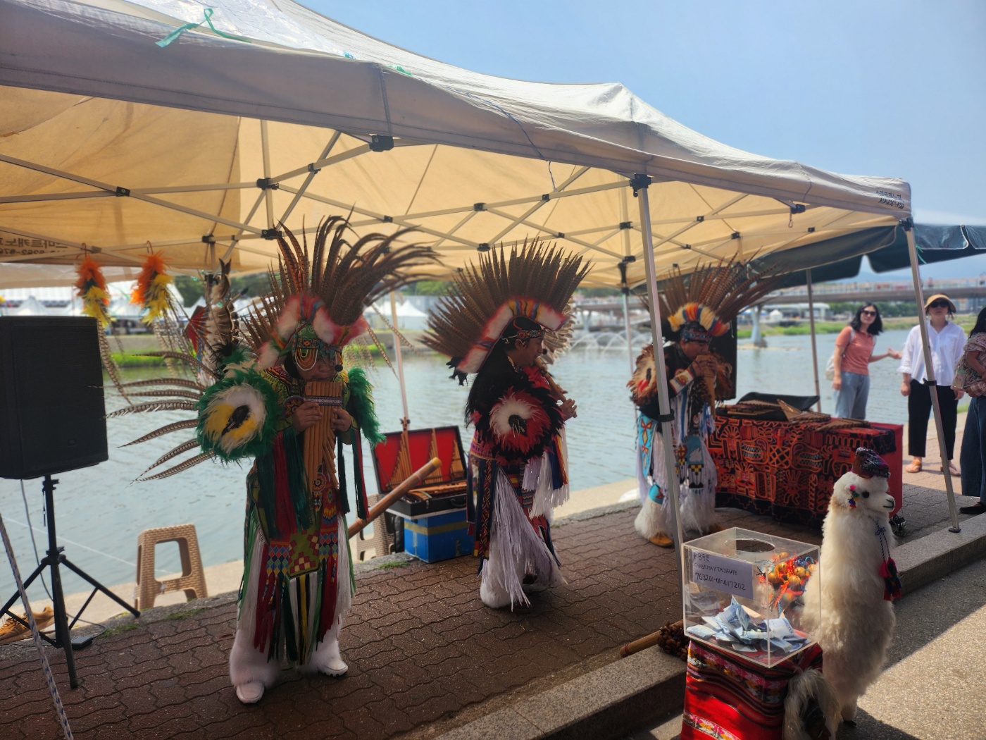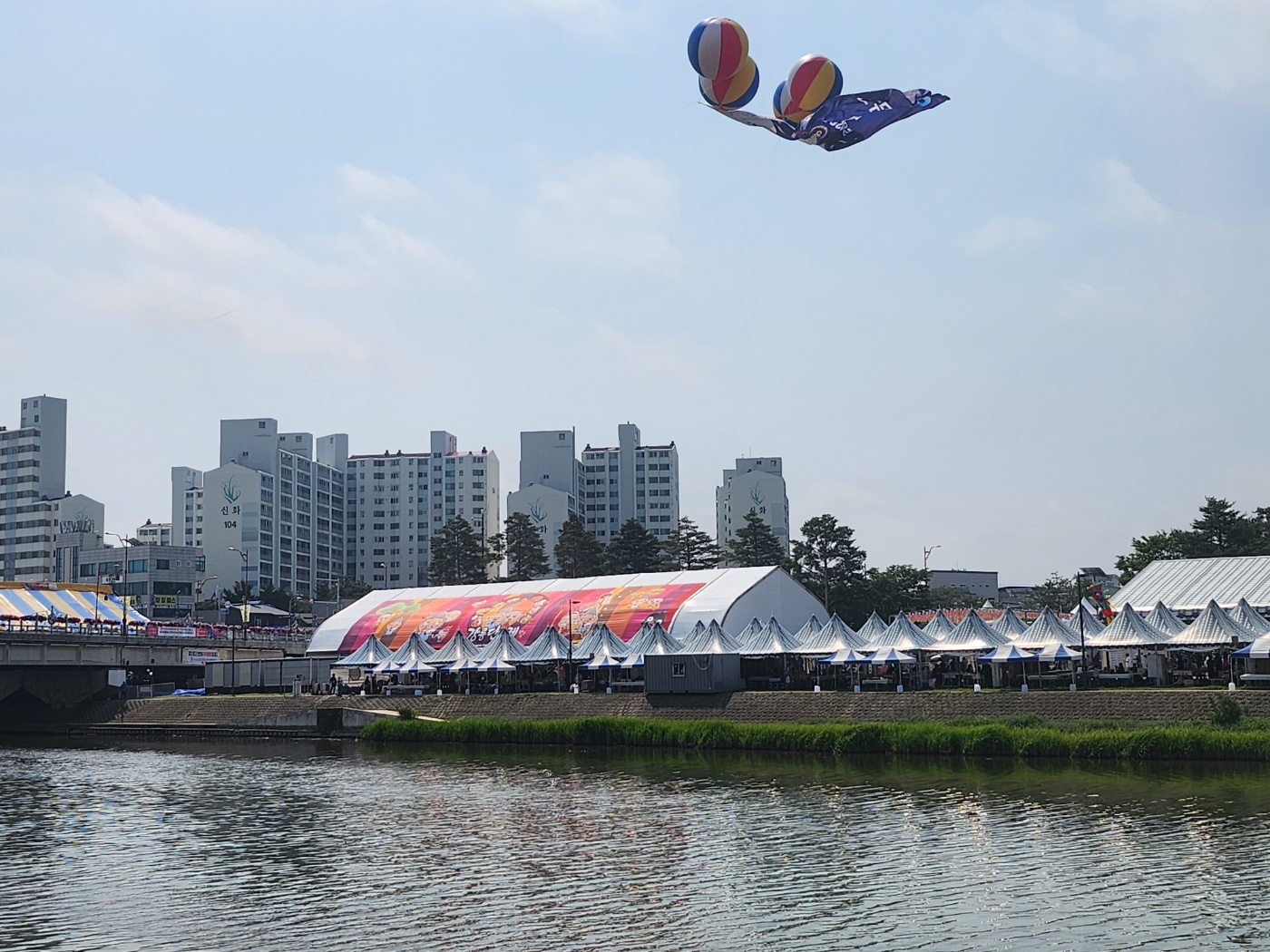 다리 위에 서서 강 건너편을 보니, 천막과 사람들이 움직이는 그 자체가 한 편의 그림 같았습니다.