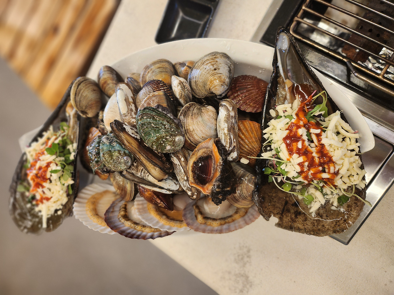 조개구이 구성: 전복, 가리비, 소라 등 해산물 모둠