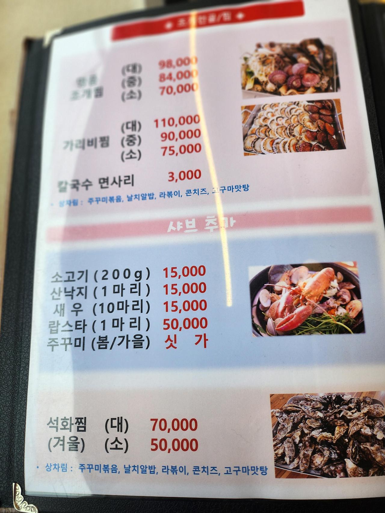 "오이도 조개구이 해물칼국수 메뉴판 가격표"