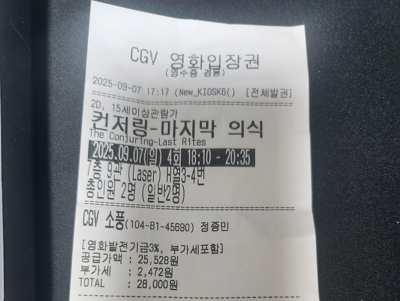 오늘은 오랜만에 극장에 다녀왔어요. CGV 소풍에서 상영 중인 **〈컨저링: 마지막 의식〉(The Conjuring: Last Rites)**을 친구와 함께 봤어요.