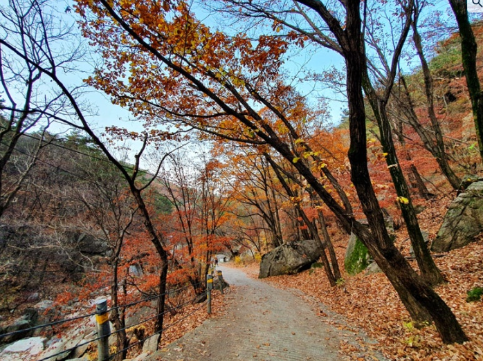 붉은 단풍길, 노란 은행나무길, 낙엽이 쌓인 오솔길.